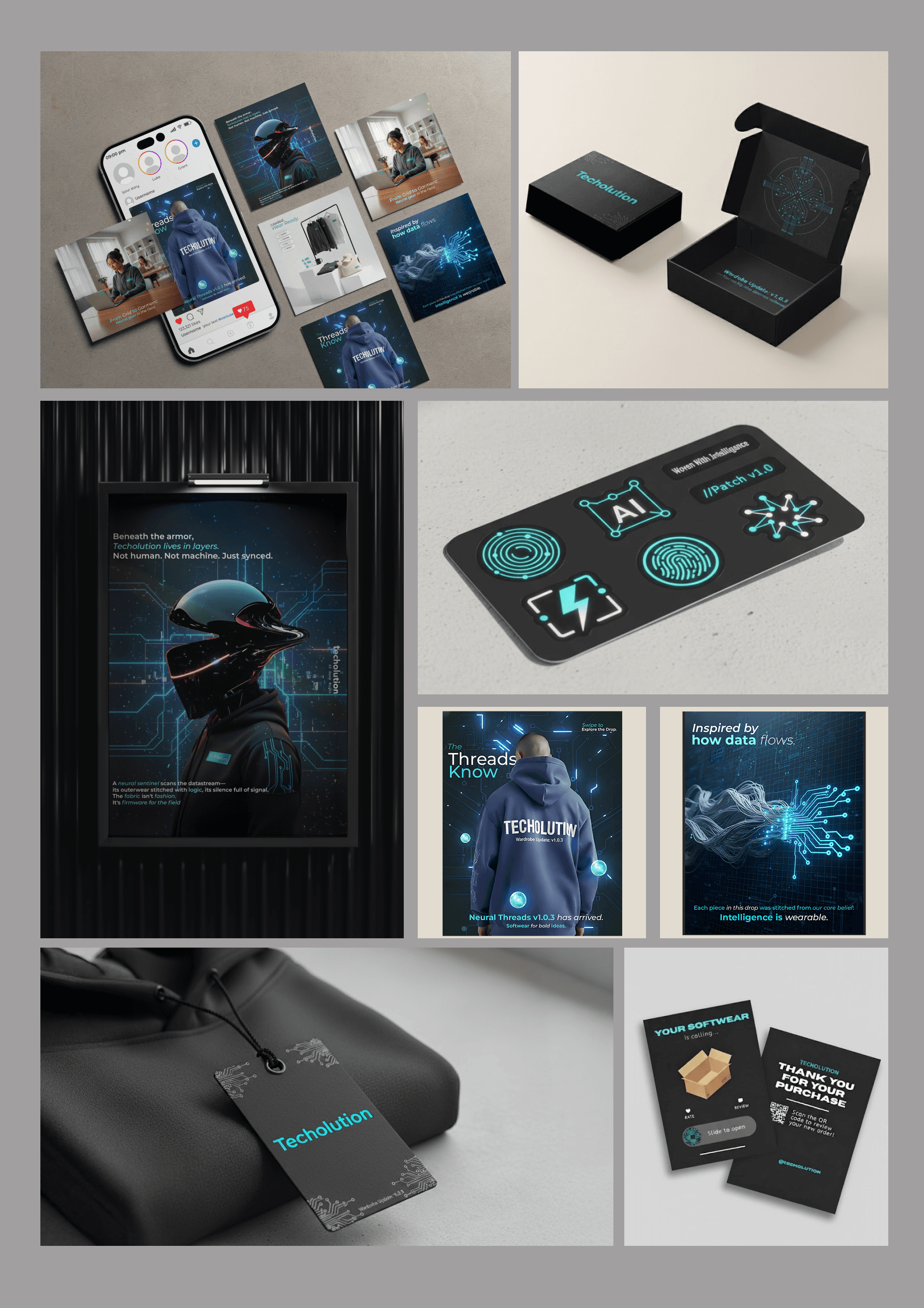 A future-forward visual system built around circuitry, neural pathways, and soft techwear aesthetics.